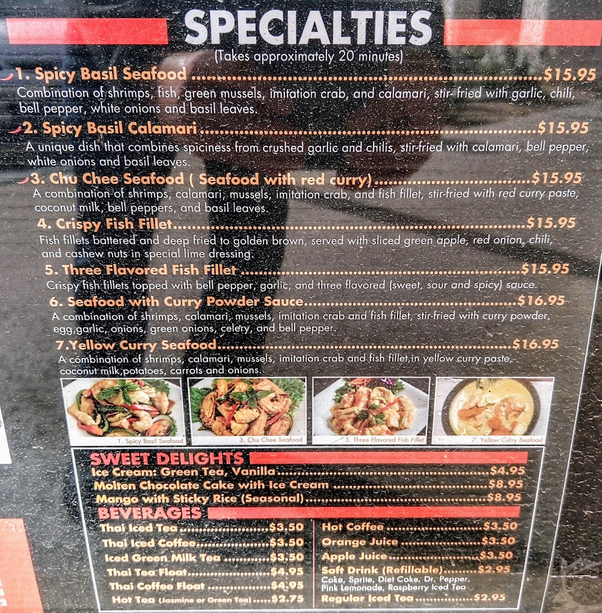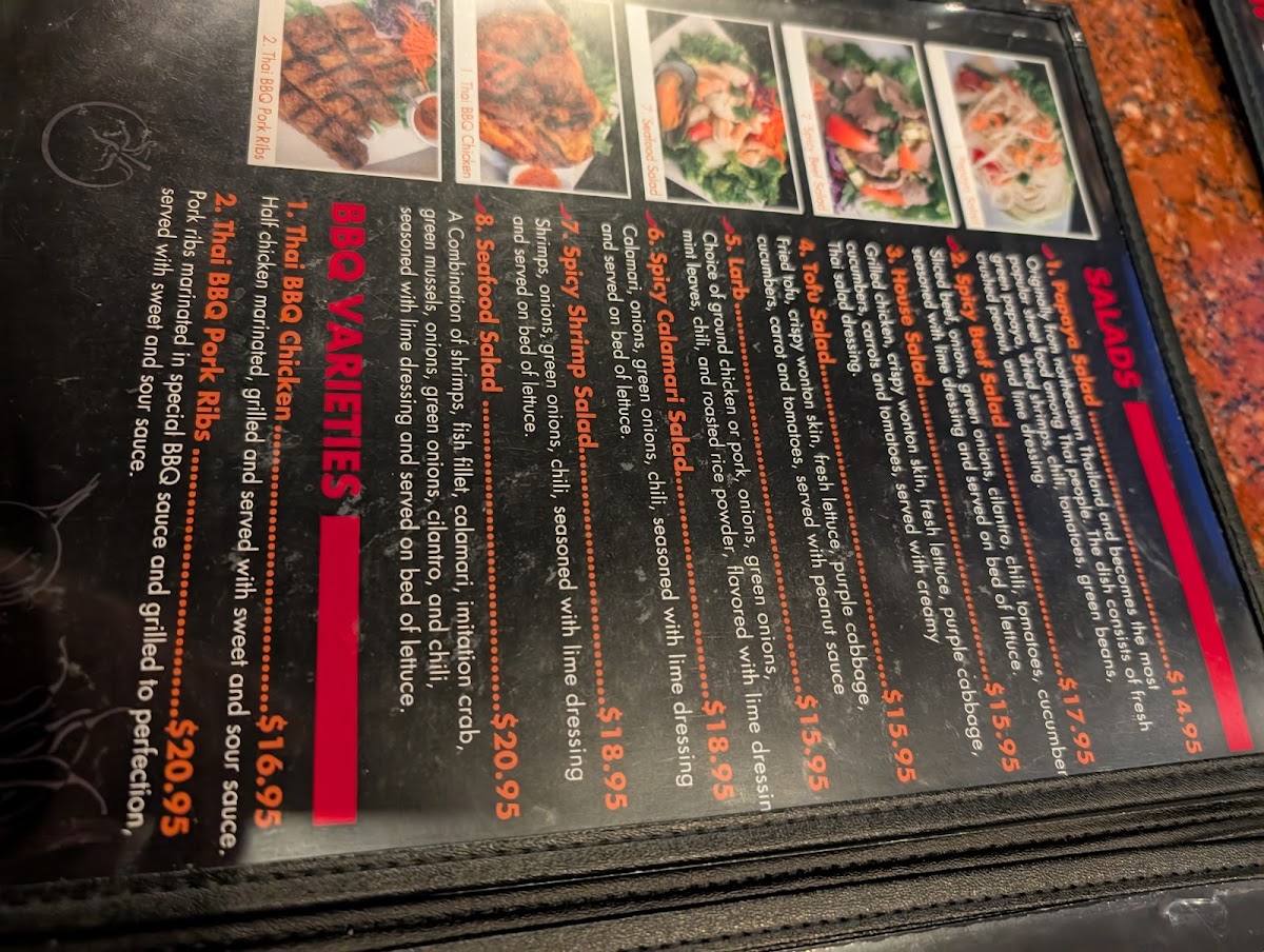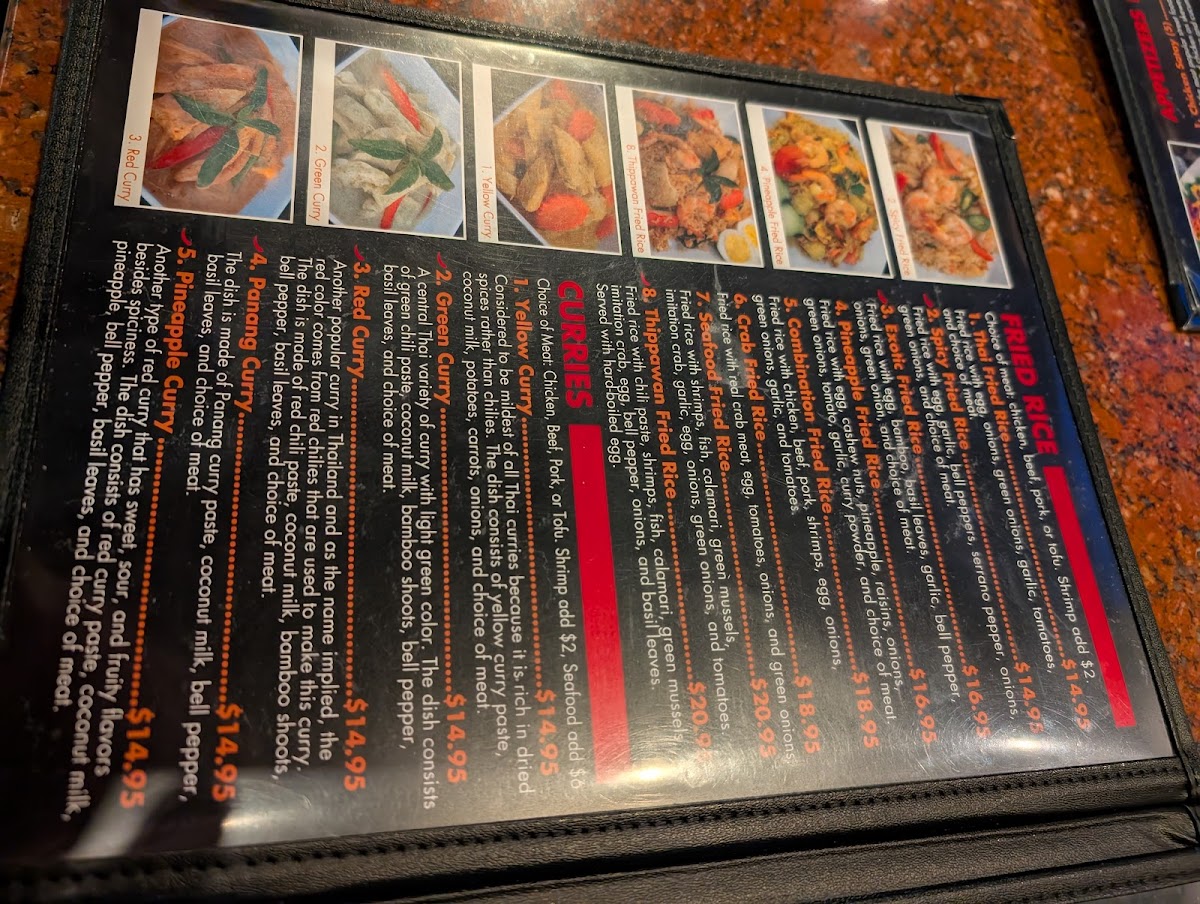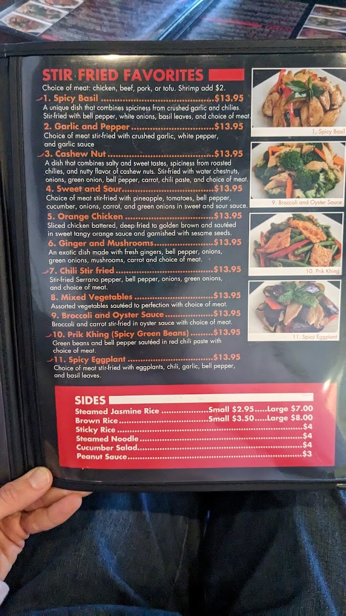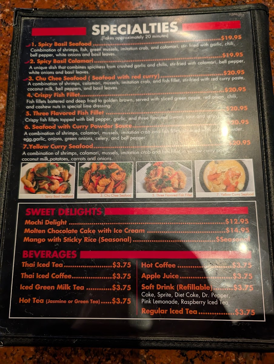 Start your culinary journey with their Spicy Basil dish, a delightful combination of crushed garlic and chilies, stir-fried with fresh bell peppers, onions, and your choice of meat for just $10.95. Each bite offers an explosion of flavors that dance on your palate, perfectly balancing heat and savoriness. For seafood lovers, the Spicy Basil Seafood takes center stage—a harmonious blend of shrimps, fish, calamari, and more, all sizzling together in a medley of spices and herbs for $15.95. This dish is a testament to the restaurant's excellence, capturing the essence of Thai cuisine beautifully.